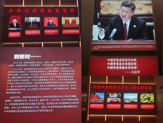 “复兴之路新时代部分”在复兴之路基本陈列的基础上,浓缩了“砥砺奋进的五年”大型成就展精华部分,以习近平新时代中国特色社会主义思想为指导,全面展示党的十八大以来,以习近平同志为核心的党中央团结带领全国各族人民,统筹推进“五位一体”总体布局,协调推进“四个全面”战略布局,党和国家各项事业取得的历史性成就、发生的历史性变革,集中展示我们党治国理政的高超智慧、卓越能力,突出展示全国各地认真学习宣传贯彻党的十九大精神的情况。