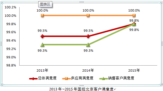 2015年度客户总体满意度为99.8%。供应商满意度为100%,销售客户满意度为99.8%,与过去两年相比,客户满意度进一步提升,其中总体满意度上升了0.3个百分点,供应商满意度仍为100%,销售客户满意度上升了0.5个百分点。调查结果显示:上下游客户对我公司服务满意度高,我公司将持续提升,力争为上下游客户提供更为优质,更为满意的服务。